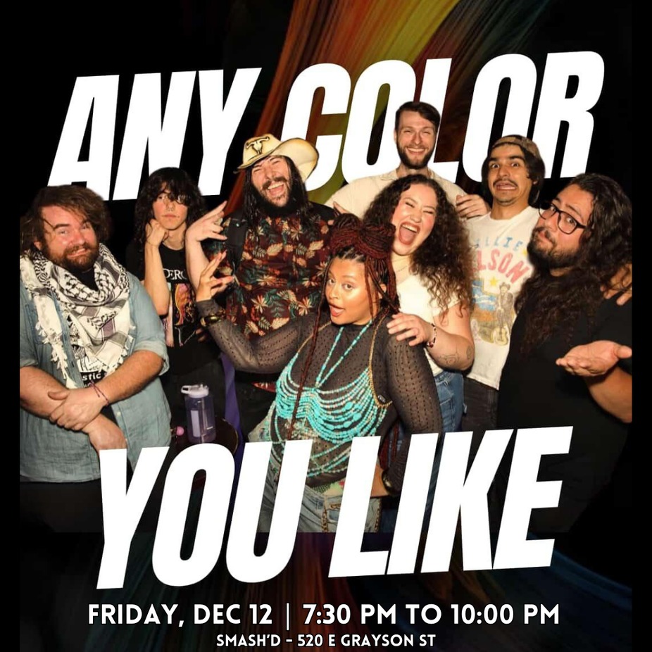 Get ready for a genre-bending ride with Any Color You Like at Smash’d on Friday, December 12 from 7:30 PM to 10:00 PM! This high-energy 5-piece from San Antonio brings the stage to life with hair-swinging passion and a fearless blend of soul, prog, fusion, hip hop, and psychedelic mystic-folk.