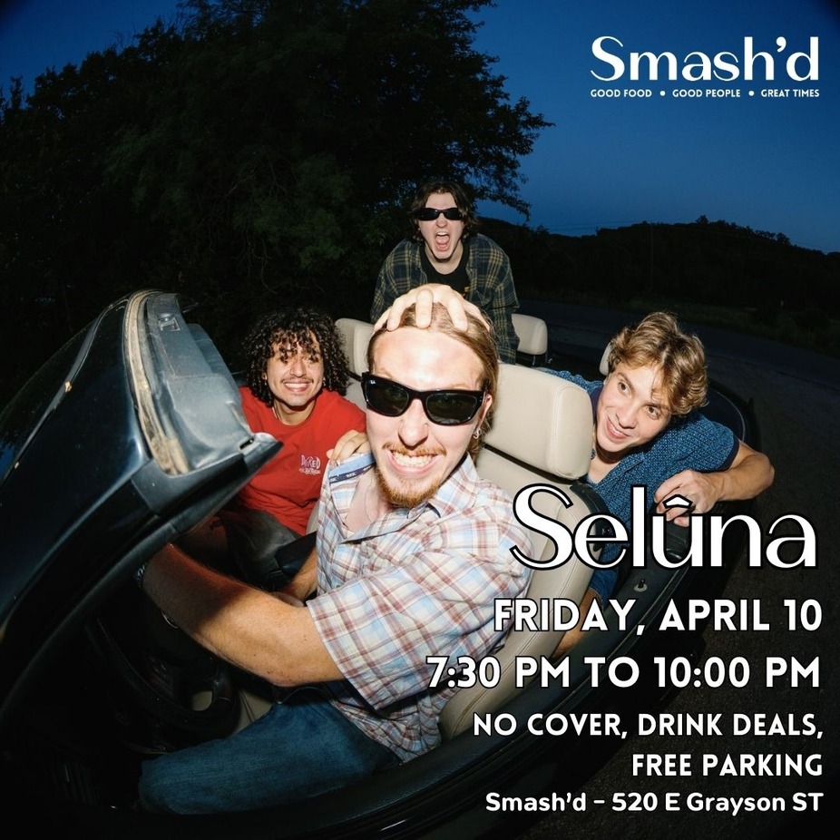 Join us on Friday, April 10 at 7:30 PM for a live performance by Selûna at Smash’d! This Austin-based indie rock band blends driving rhythms, atmospheric textures, and emotionally charged melodies into a dynamic live show that pulls you in from the first note.