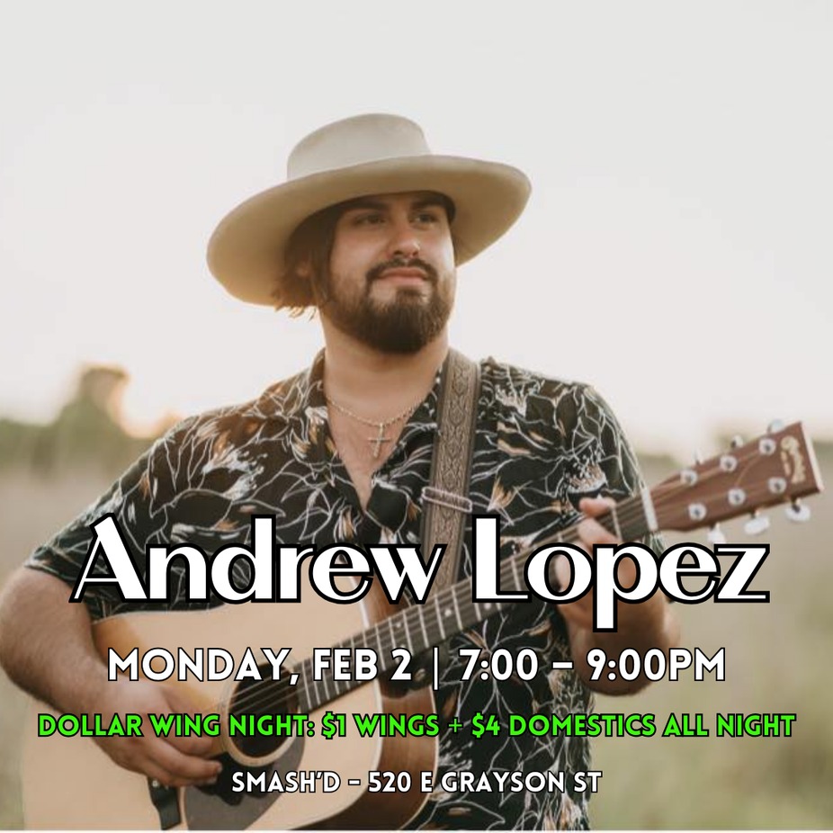 Join us on Monday, February 2 from 7:00 to 9:00 PM for live music by Andrew Lopez. Settle in with great food, refreshing drinks, and an acoustic set that will make your Monday night feel easy. While you enjoy the music, take advantage of our Monday specials: $1 wings available all day and $4 domestic beers. It’s the perfect way to kick off your week at Smash’d.