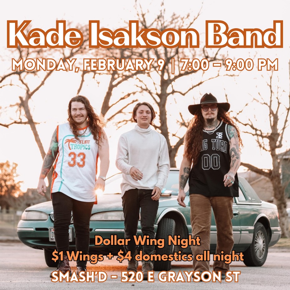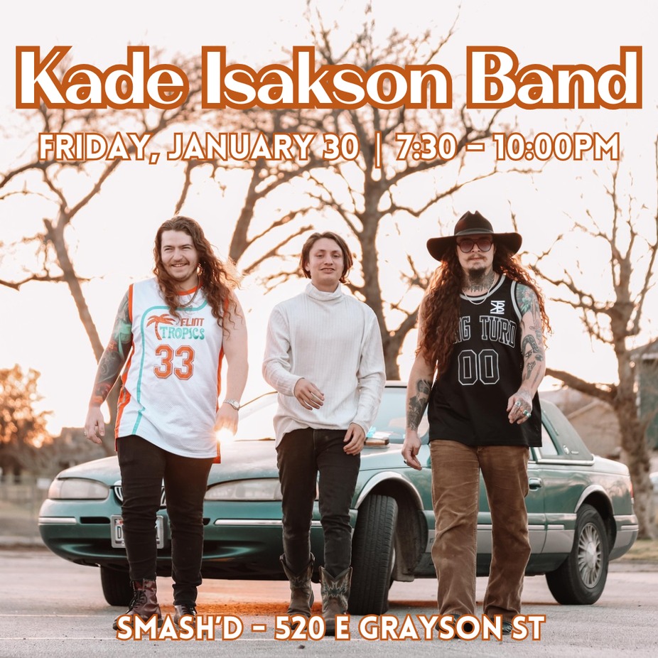 Join us Monday, November 10 from 7:00 PM to 9:00 PM at Smash’d for a powerful live set from the Kade Isakson Band! Blending country, classical, and rock with cinematic flair, this New Braunfels-based group brings raw talent and high energy to every stage.