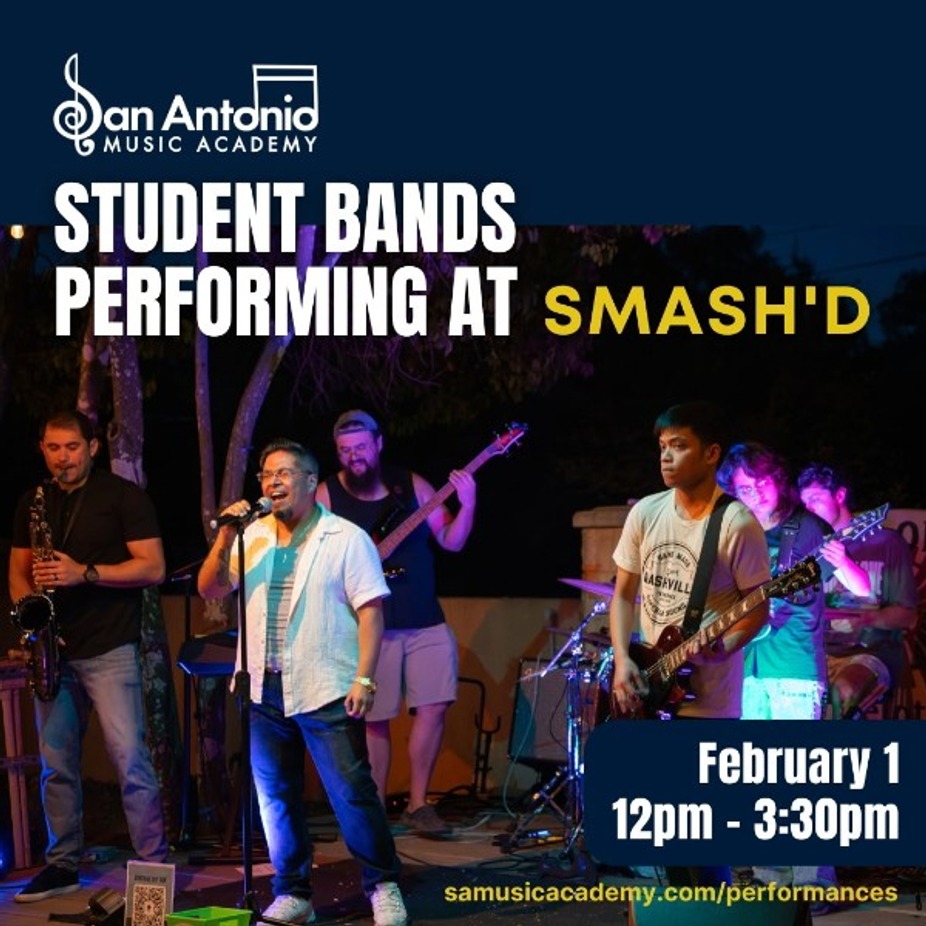 Join us on Sunday, January 25 from 12:00 PM to 3:30 PM for a live performance by local student bands from San Antonio Music Academy! Featuring: Orangutan Ramparts – 12:00pm Evel Knievels – 12:40pm After Hours – 1:30pm Pop Rocks – 2:20pm Red Med Mavens – 2:50pm