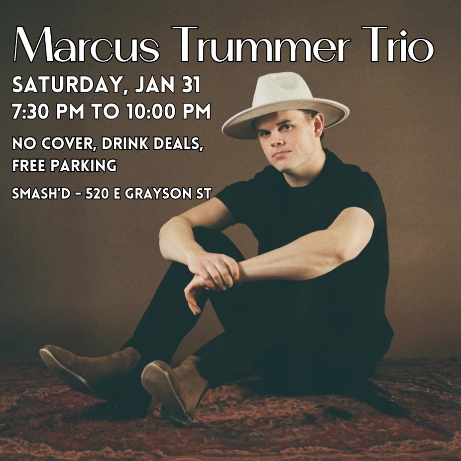 Join us Friday, January 30 from 7:30 PM to 10:00 PM at Smash’d for a powerful live set from the Kade Isakson Band! Blending country, classical, and rock with cinematic flair, this New Braunfels-based group brings raw talent and high energy to every stage. Led by singer-songwriter Kade Isakson, the band’s unique sound is brought to life by a dynamic lineup of musicians on cello, upright bass, lead guitar, and drums. From dive bars to stadiums, they deliver original music with passion, precision, and undeniable presence. Don’t miss the chance to experience their genre-crossing sound in action!MARCUS TRUMMER TRIO