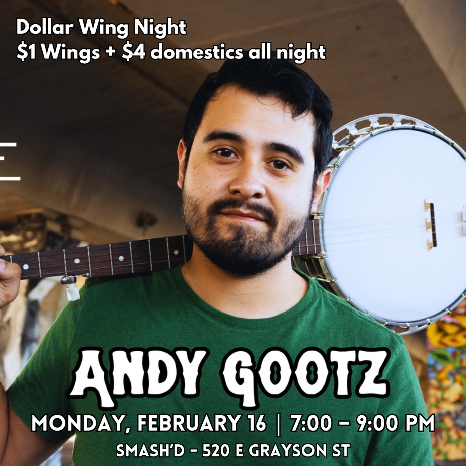 Join us on Monday, February 16 from 7:00–9:00 PM for a live performance by Andy Grootz at Smash’d! Blending folk, bluegrass, and Americana with a modern twist, Andy delivers warm, high-energy sets full of storytelling, crowd favorites, and sing-along moments. Come enjoy great live music, good vibes, and your favorite food and drinks for an easy, feel-good night out.